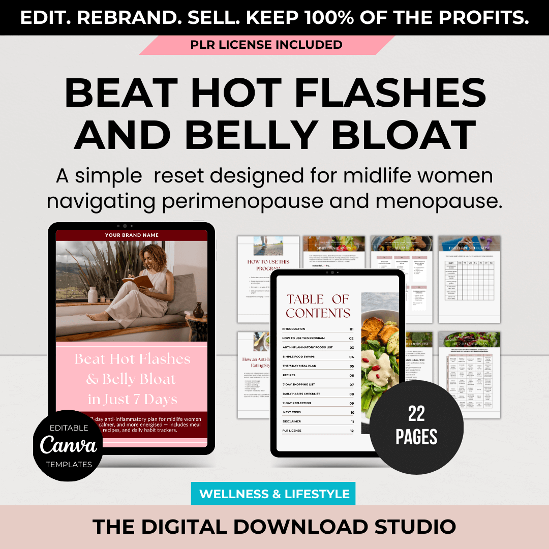 Beat Hot Flashes & Belly Bloat in Just 7 Days is a practical, supportive digital guide created for women navigating perimenopause and menopause.