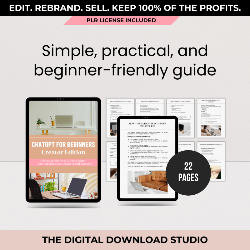A beginner-friendly guide to using ChatGPT effectively for digital product creation. PLR license included.