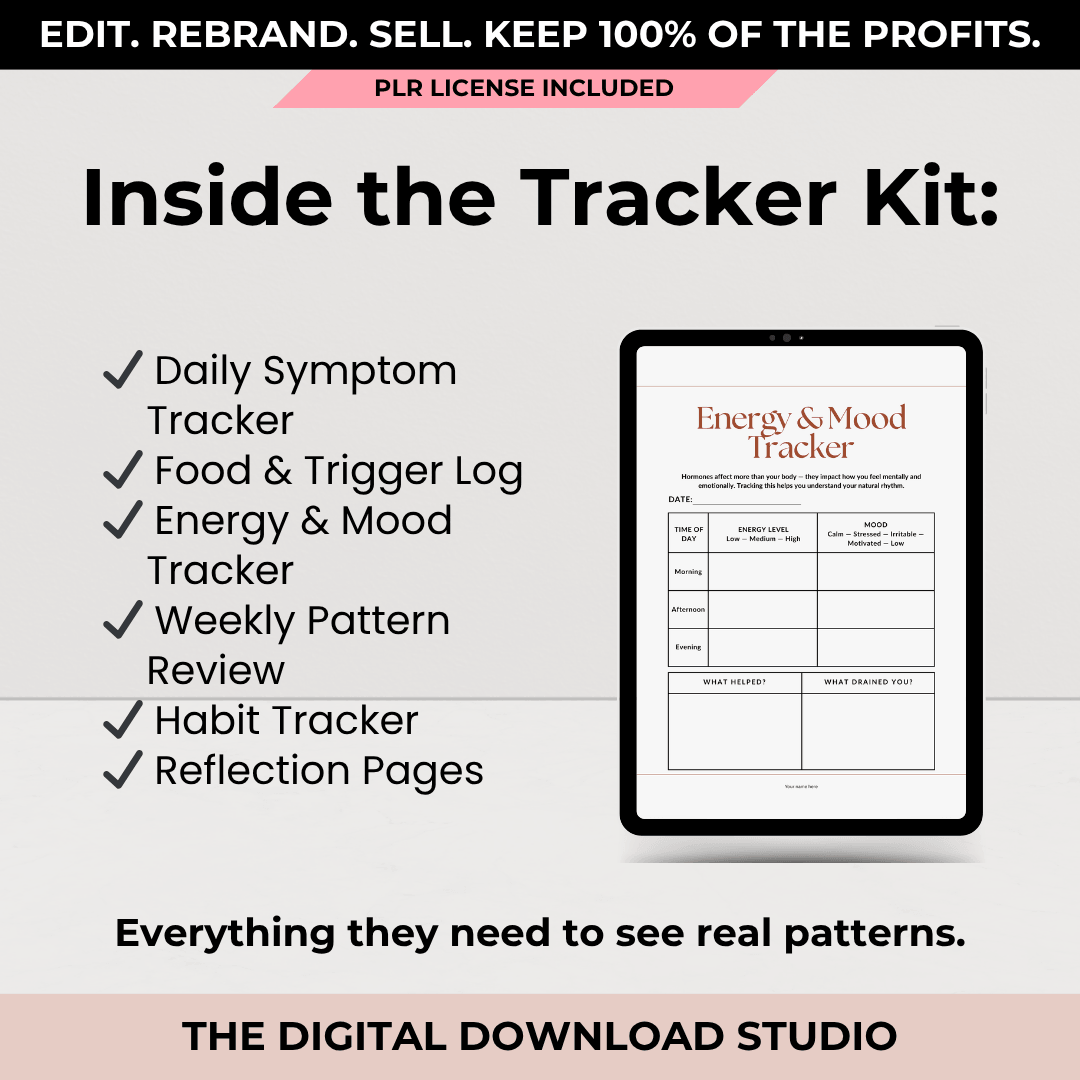 A simple, done-for-you Hormone Tracker Kit designed to help midlife women track symptoms, identify triggers, and feel more in control of their body — without overwhelm.