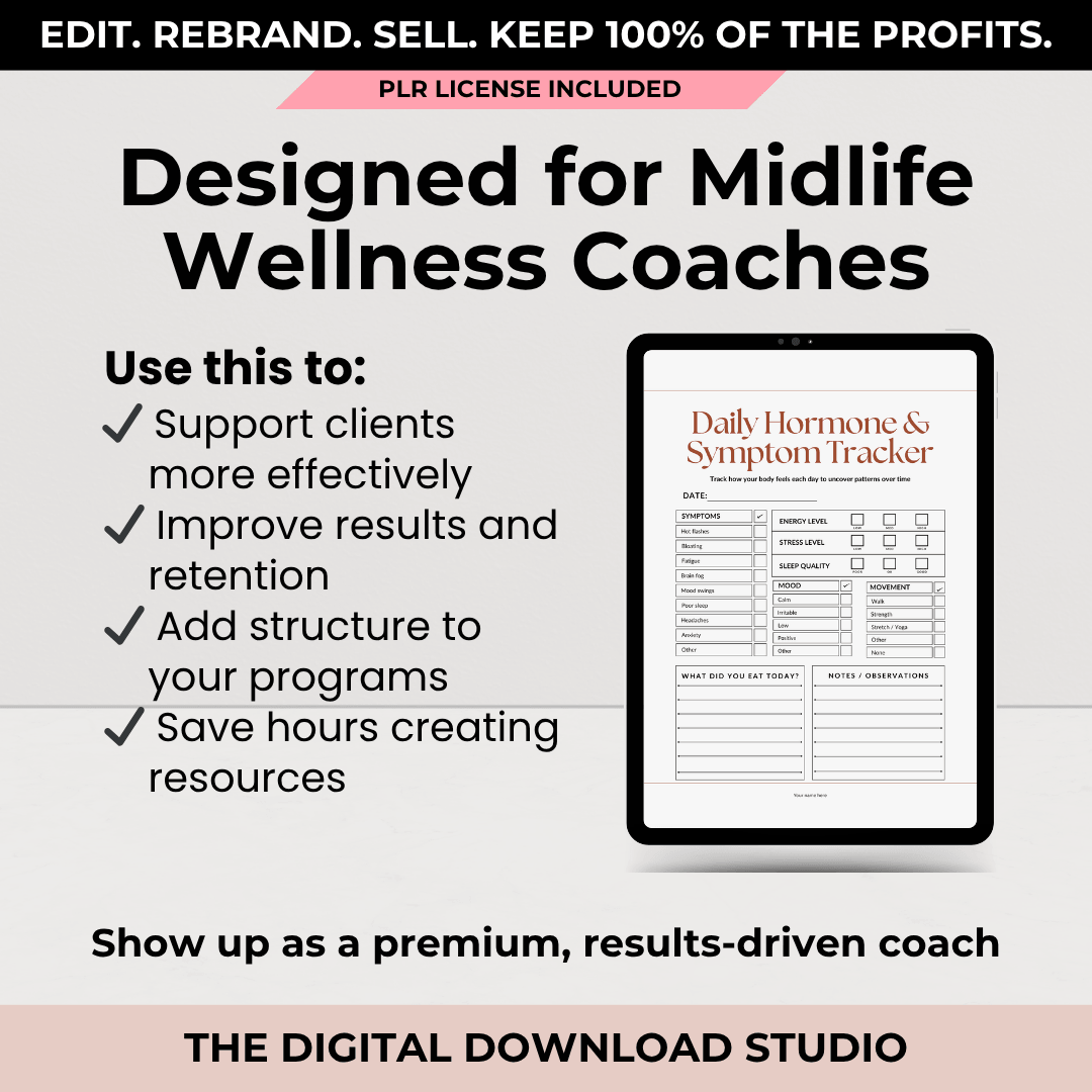 The Midlife Hormone Tracker Kit is a simple, supportive, done-for-you tracking system created for women navigating perimenopause and menopause — and for wellness coaches who want to support their clients more effectively.